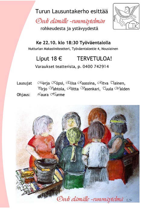 Ensiesityksen 12.10. saanut Turun Lausuntakerhon runonäytelmä esitetään ke 22.10. klo 18:30 alkaen Työväentalolla Nutturlan Makasiiniteatterissa (Työväentalontie 4, Nousiainen)
